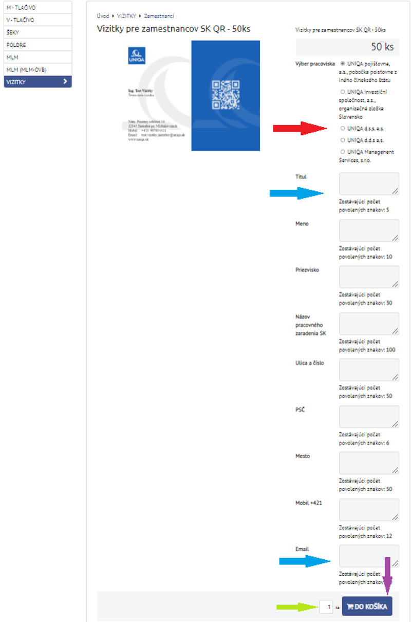 2) Údaje na vizitke (všetky zobrazené kolonky okrem titul sú povinné) →