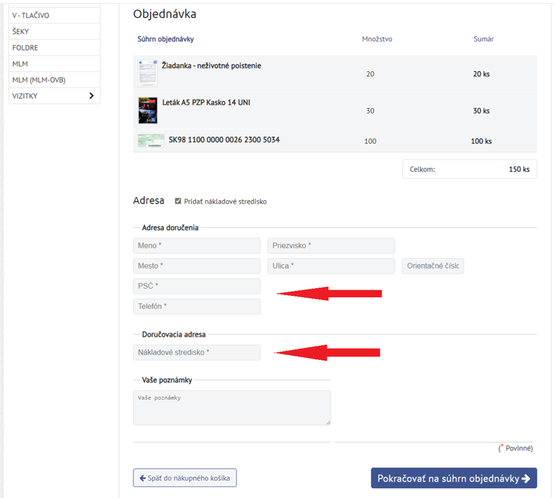 Pokiaľ je všetok tovar, ktorý požadujete v košíku, kliknite na tlačítko "Objednať". V ďalšom kroku Vás systém vyzve na zadanie adresy, kam bude tovar zaslaný. Povinné sú všetky kolonky adresy a "Nákladové stredisko". Systém overuje platnosť údajov, telefónne číslo zadávajte v tvare +421XXXYYYZZZ. Kliknite na "Pokračovať na súhrn objednávky" a po kontrole všetkých údajov tlačítko "Dokončenie objednávky!"