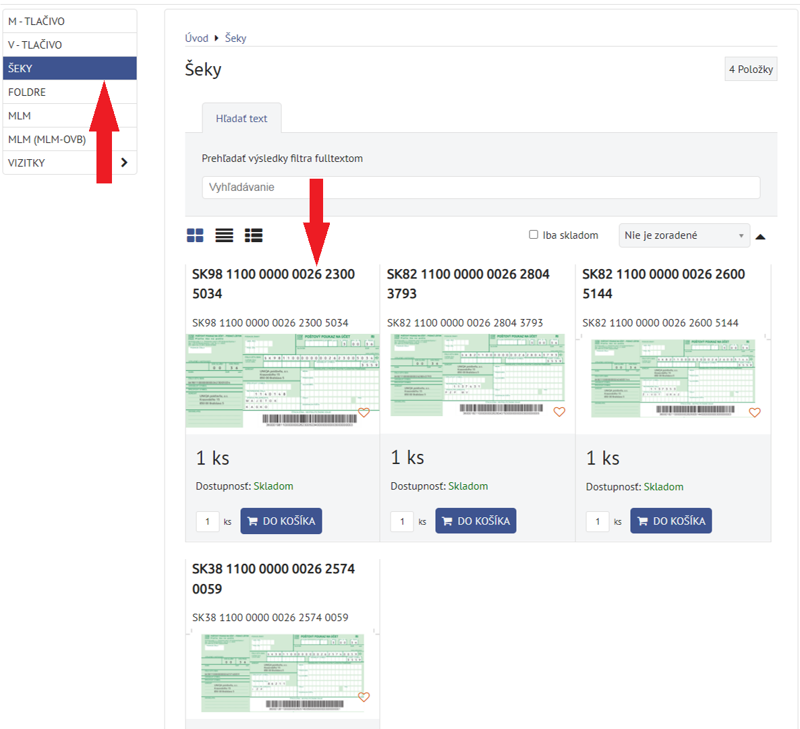 Po kliknutí na vybranú kategóriu uvidíte príslušné produkty (tlačivá). Napr. ak potrebujete šeky, kliknete na ŠEKY a otvorí Vám ponuku zo šekmi a následne si pridáte do košíka počet šekov, ktorý potrebujete. Niektoré produkty majú doplnkové informácie, ktoré uvidíte po kliknutí na príslušný názov / obrázok Vami vybraného produktu (taktiež je možne po ďalšom kliknutí na obrázok si tento zväčšiť)